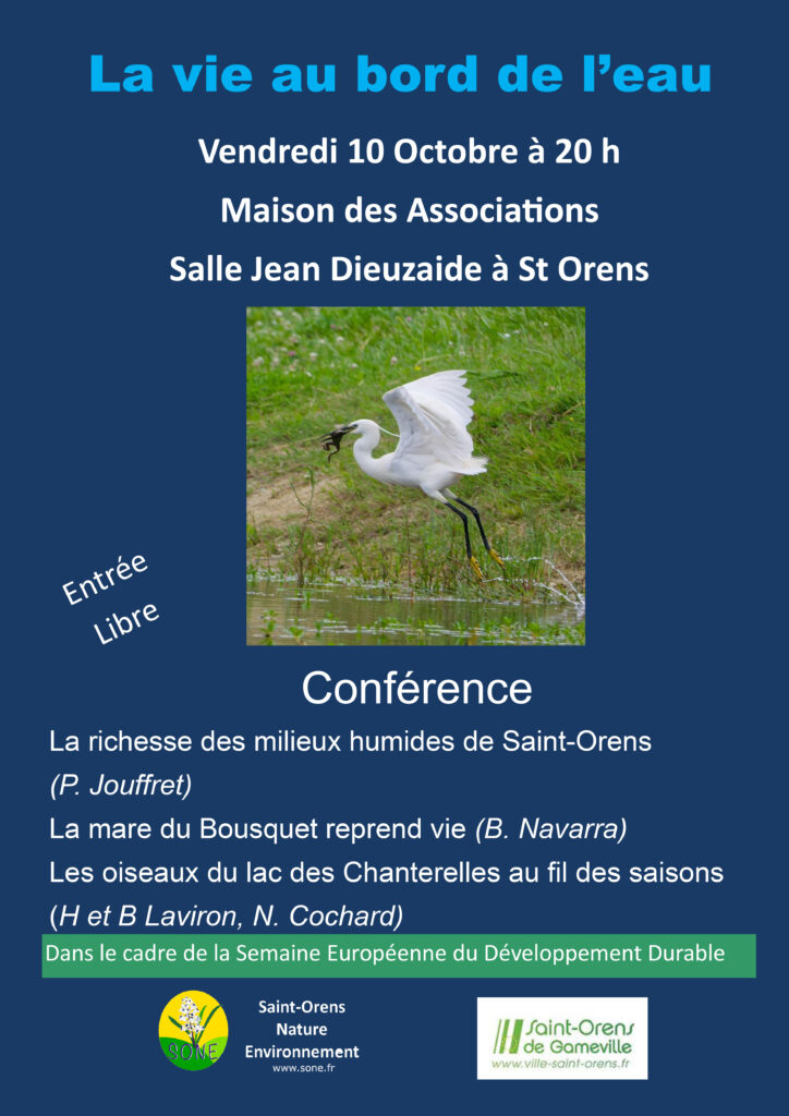 La conférence SONE « La vie au bord de l’eau » aura lieu vendredi 10 octobre à 20 h à la Maison des associations à Saint-Orens. Son entrée est libre et nous vous invitons à y participer.